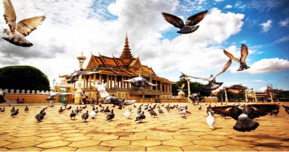 Bên ngoài khuôn viên Cung điện Hoàng Gia, bạn sẽ thấy có một sảnh sân trống lớn. Người ta thường nói "Đất lành thì chim đậu", khoảng sân này hằng ngày có rất nhiều bồ câu đến tìm kiếm thức ăn và nô đùa cùng du khách. Nếu có dịp đến cung điện Hoàng Gia Campuchia, bạn hãy thử check in cùng những chú bồ câu dễ thương này nhé!